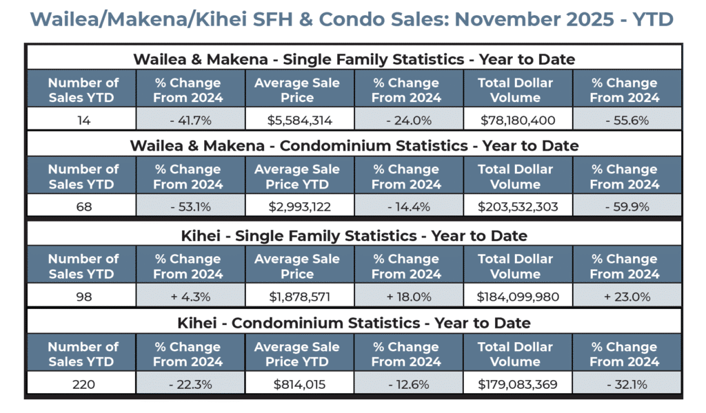 While sales volume for November was low, this reflects the overall slowdown in luxury condos islandwide, not a decline in demand for Wailea-quality product. Year-to-date, Wailea/Makena condo sales are down 53.1%, but median prices remain above $2M YTD, demonstrating the durability of the luxury segment.